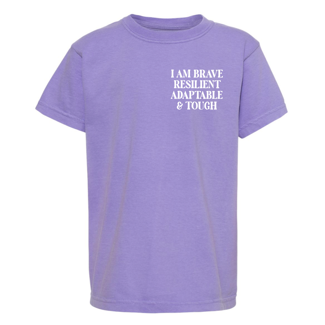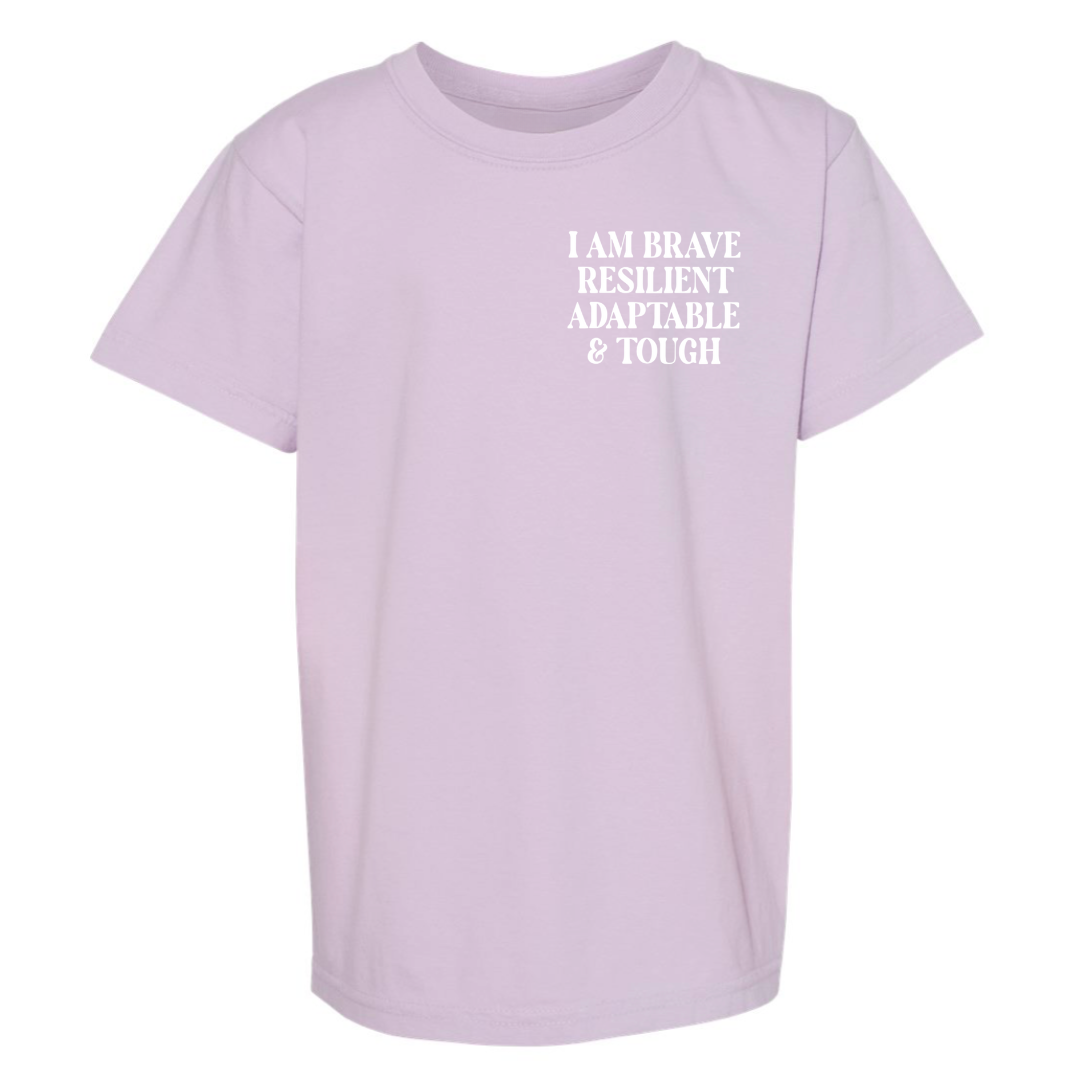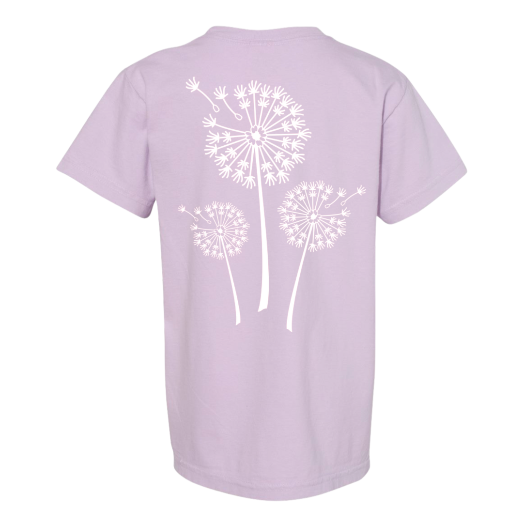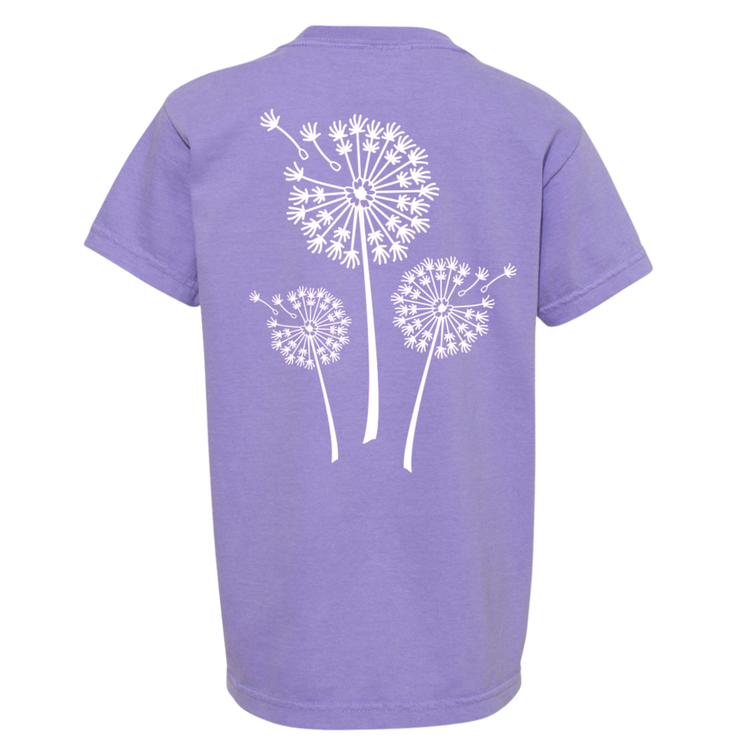 Soft youth tee in a calming orchid or violet shade, printed with delicate white dandelion silhouettes on the back and a small empowering affirmation on the chest. Purple is the official color for the Military Child!