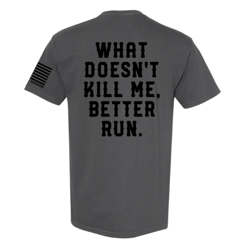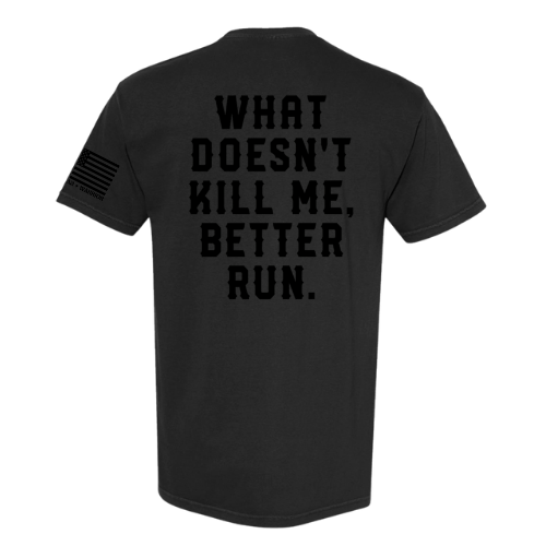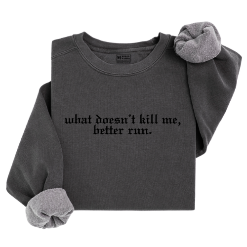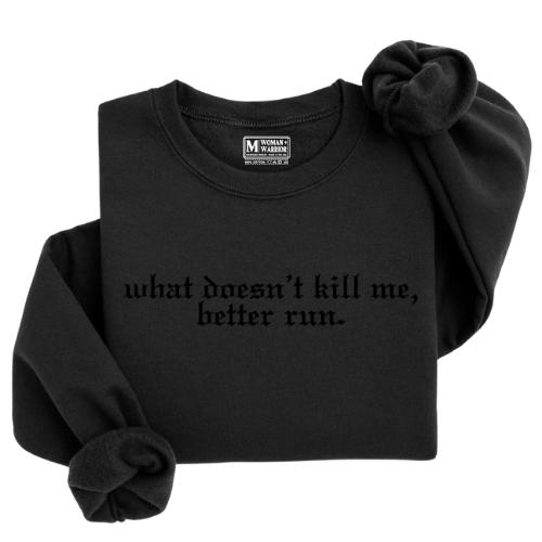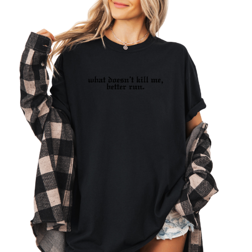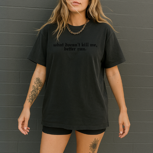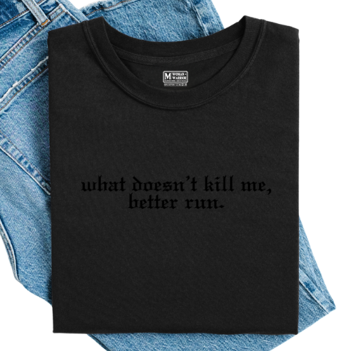 Minimalist gothic-font design: “What Doesn’t Kill Me, Better Run.”